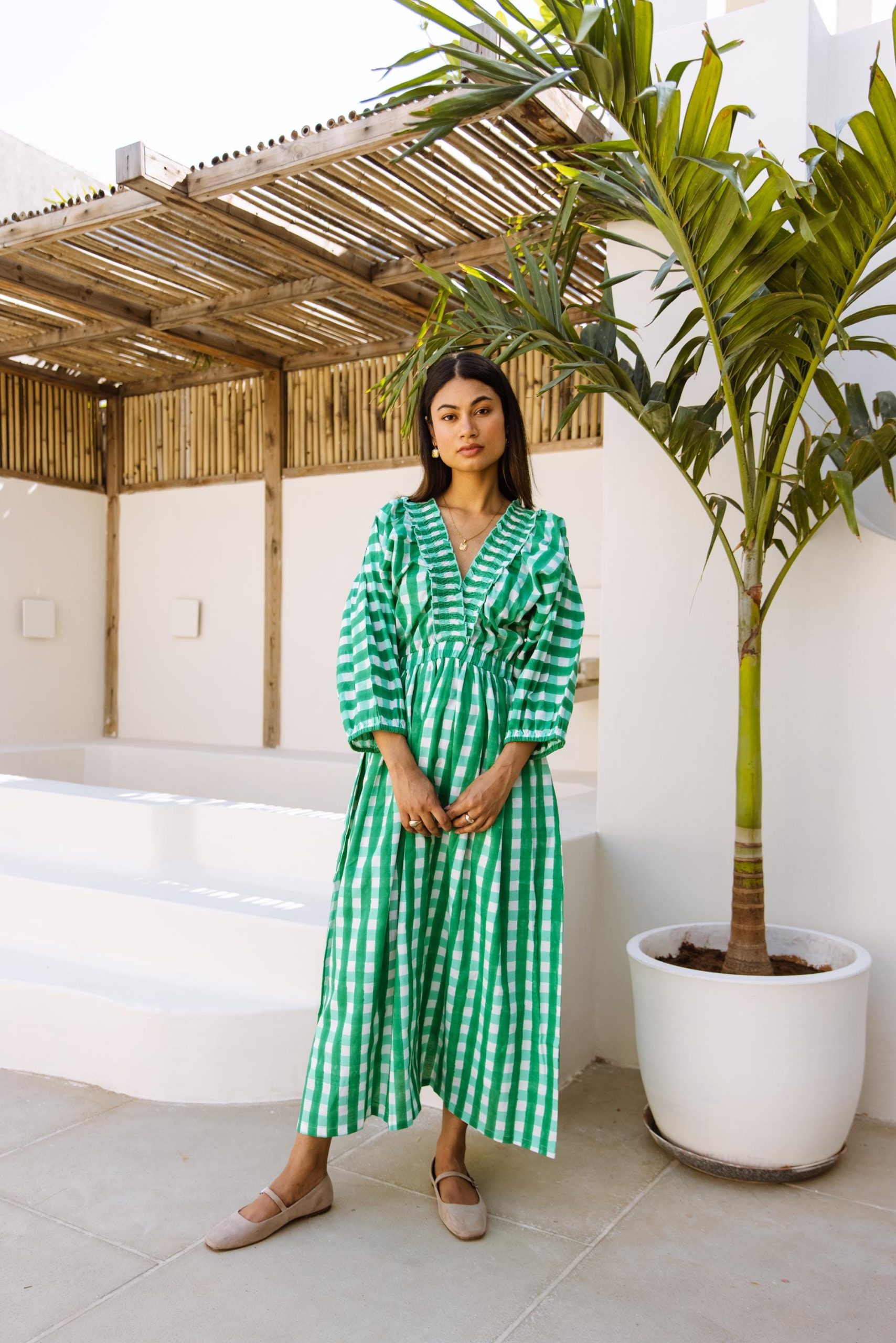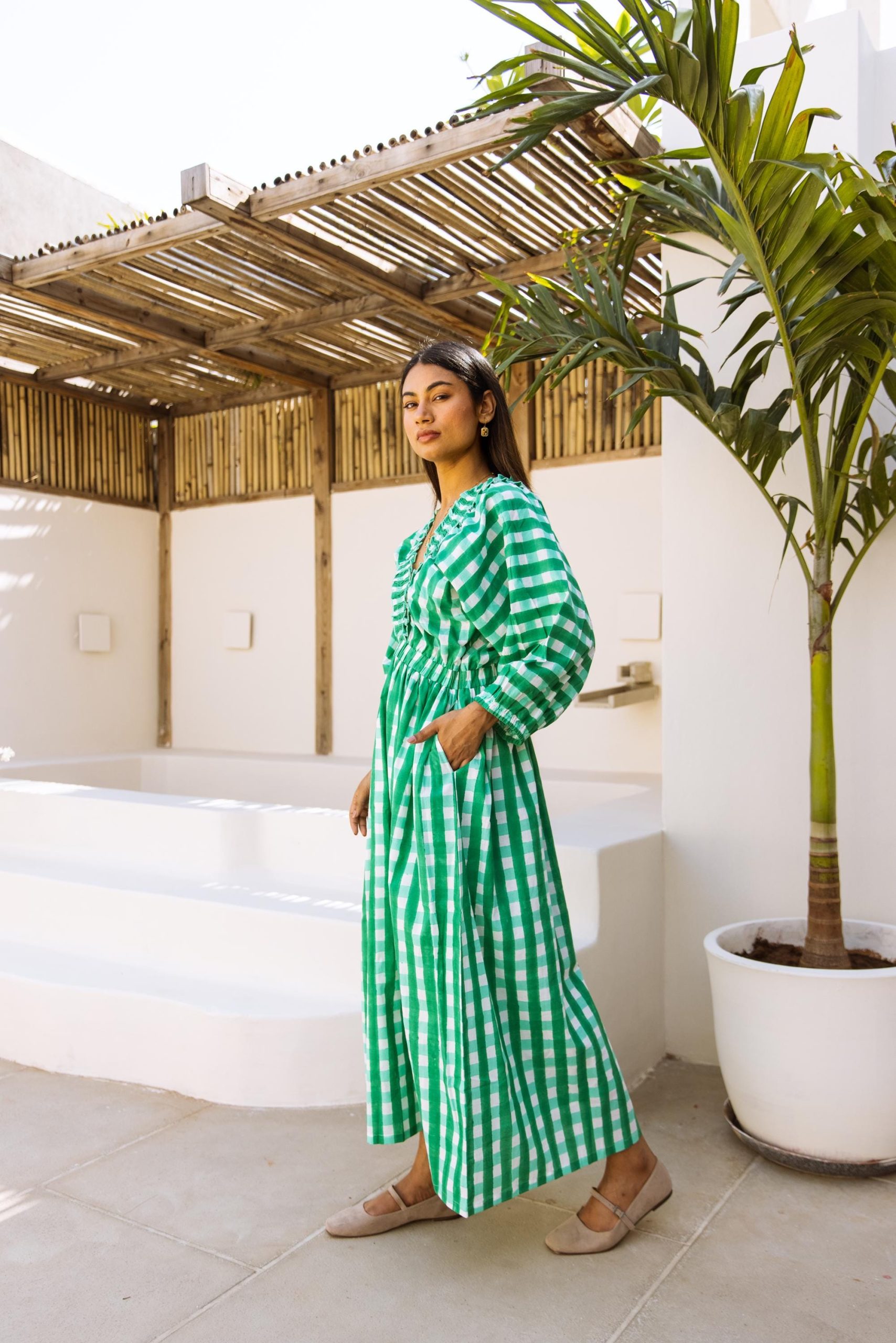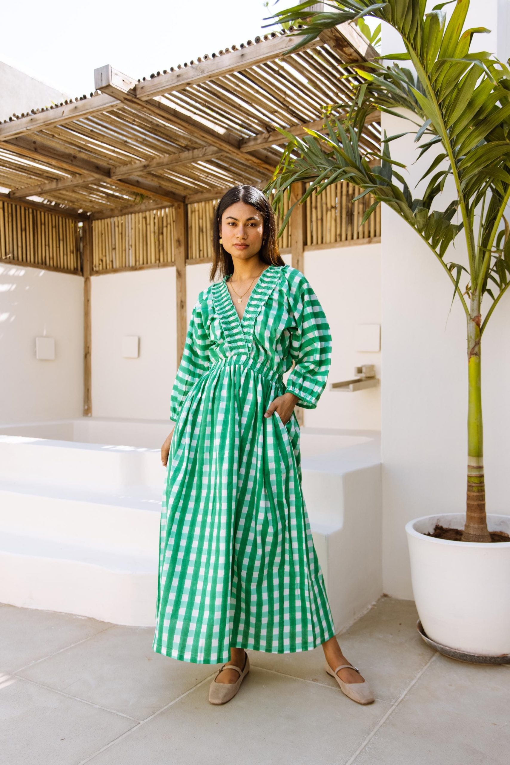 This cotton beauty brings all the joy with its bold block-printed gingham pattern and breezy silhouette. Designed for fun days and good vibes, it’s got pockets, voluminous puff sleeves that make a statement, and a flattering V-neck with a frill detail that adds just the right amount of flirt.